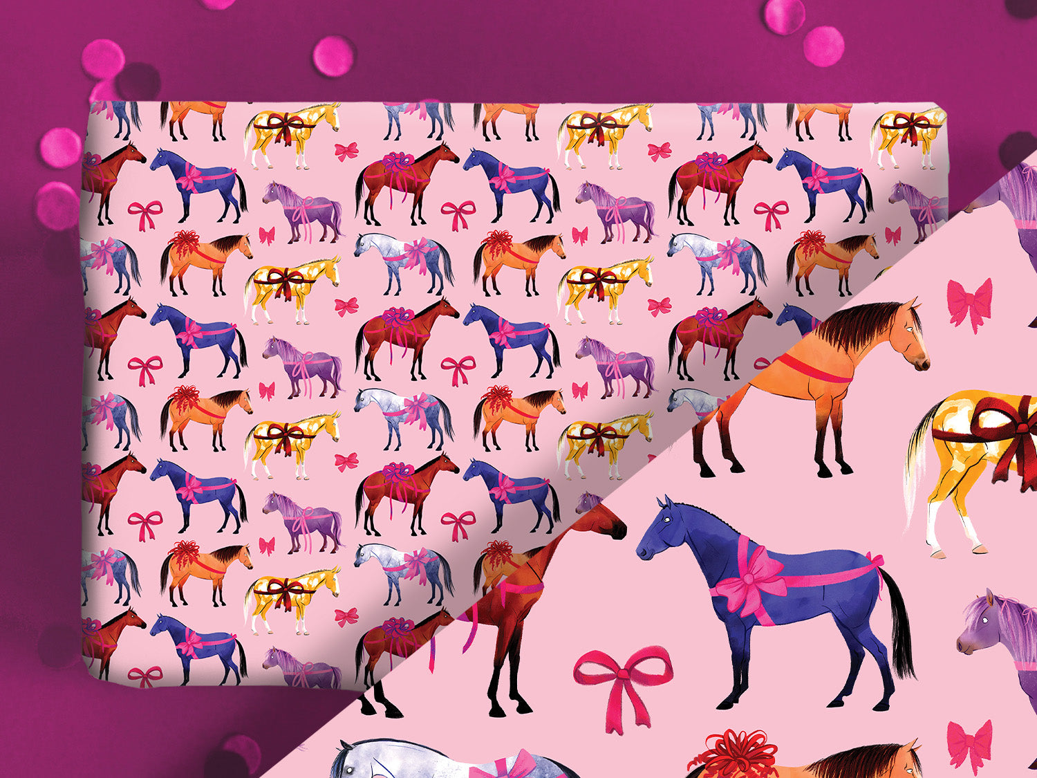Do they want a horse for their birthday/the holidays/just cause? This vibrant wrapping paper might be a good stand-in (for now). Featuring equine artwork titled "Something For Everyone", it brings fun character to any gift - for any horse lover you know, no matter the discipline(s)! A pattern parade of brightly colored gift horses (wrapped in cute gift bows to boot), hand-drawn by artist Maria DeCerce. Dream horses of all shapes, colors, and sizes - Thoroughbred, Quarter Horse, Warmblood, Hunter Pony, Shetland, even a Pinto Mule! The rich inks sit on a substantial 90 gsm fine art paper, available in either glossy or matte finishes, letting the colors pop or sit softly depending on the look you want. Comes in three generous lengths to cover a wide range of gifts. The one-sided print leaves the reverse clean and crisp, and a small white trim with a barcode/QR sits at the edge from production. Break this out when you want to use original equine art as wrapping paper!
